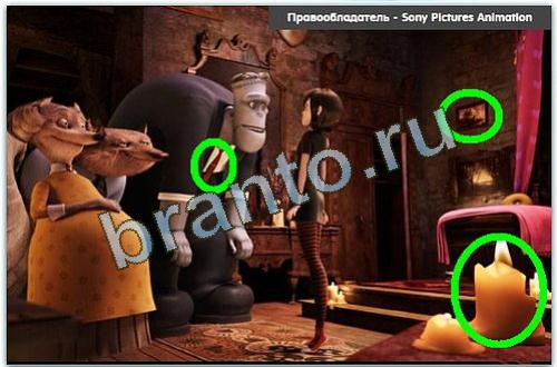 Это кадры, на которых уже отмечены ляпы (лишние детали) и предметы, которые уже расставлены на места.
