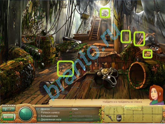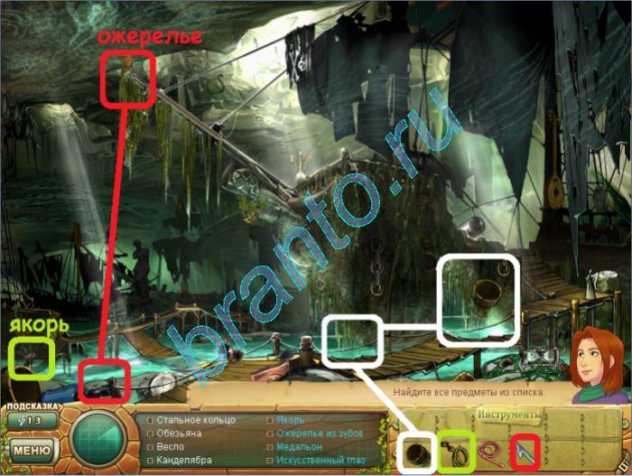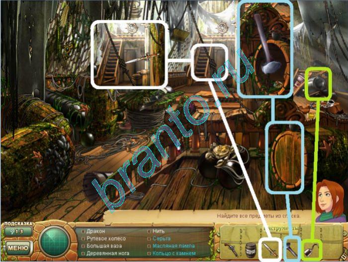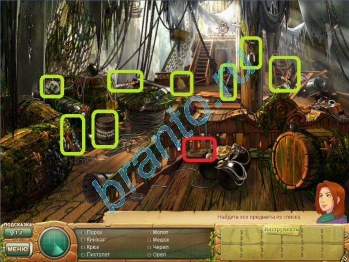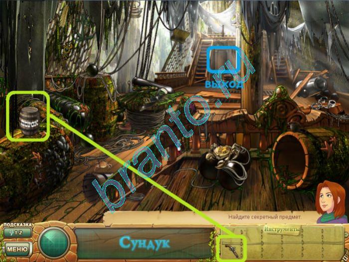 Гарпун закинье на самый нос корабля, где сидит попугай. Ожерелье из зубов упадёт в левый нижний угол.